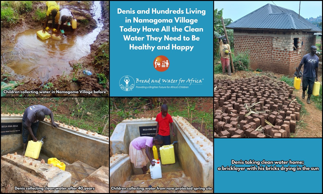 But today, thanks to the supporters of Bread and Water for Africa®, the spring is protected and “clean and safe water is readily available for all” and “they now save the money they used to spend in search of clean water.”