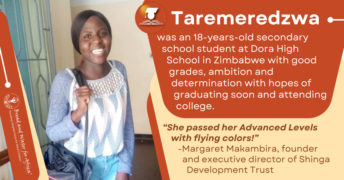 Taremeredzwa was an 18-years-old secondary school student at Dora High School in Zimbabwe with good grades, ambition and determination with hopes of graduating soon and attending college.