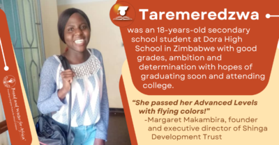 Taremeredzwa was an 18-years-old secondary school student at Dora High School in Zimbabwe with good grades, ambition and determination with hopes of graduating soon and attending college. But she was also on the verge of dropping out. Taremeredzwa, whose name means “We have been honored,” was being raised by a single mother who could barely … Continue reading Supporters of Bread and Water for Africa® Open Doors for Zimbabwean Student Now Attending University