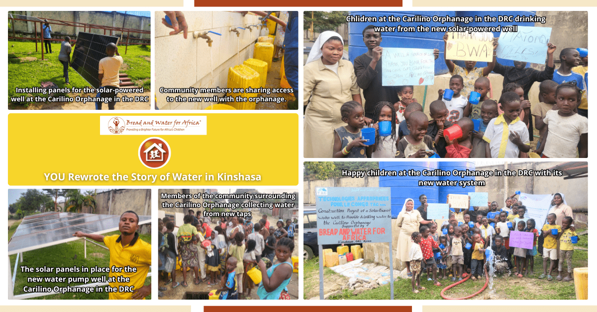 Sr. Catherine Bilepo of the Carilino orphanage told us that thanks to the generosity of the supporters of Bread and Water for Africa® “our children now have access to clean drinking water – a true source of life and health.